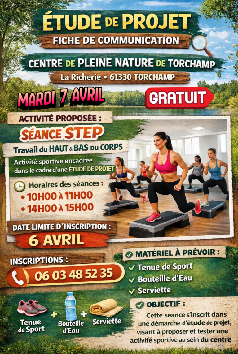 Le Centre Pleine Nature de TORCHAMP, vous propose des activités sportives le Mardi 7 Avril 2026. Réservation au 06 03 48 52 35 Enzo Lefevre,